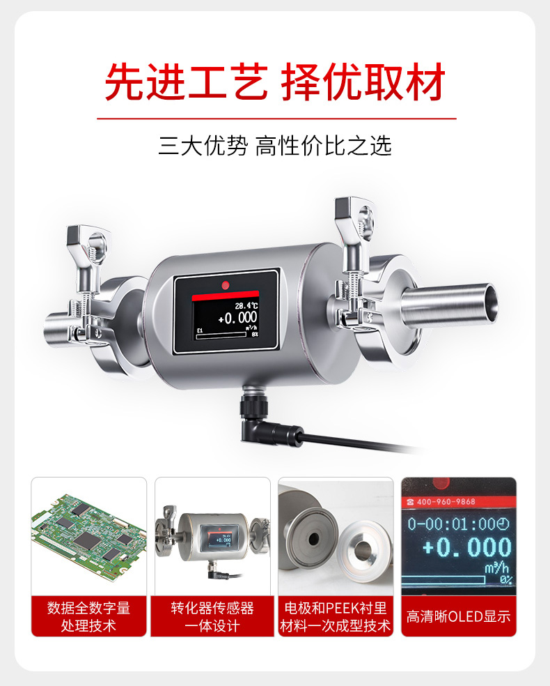 LDG-MIK卡箍式电磁流量计根据法拉第电磁感应定律进行流量测量。电磁流量计的优点是压损极小,可测流量范围大。最大流量与最小流量的比值一般为20:1以上,适用的工业管径范围宽,输出信号和被测流量呈线性,精确度较高,可测量电导率≥5μs/cm的液体。 电磁流量计卡箍式安装方式具有安装、清洗方便等优点,常应用于食品生产、制药行业药剂测量以及净水监测等场合。